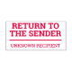 Cette conception d'estampille en caoutchouc de base comprend les messages "RETOUR À L'ENVOI" et "RECIPIENT INCONNU". Il peut être utilisé pour indiquer que le courrier reçu a été livré à la mauvaise adresse ou que le destinataire est inconnu, et doit être retourné à l'expéditeur.
