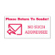 Cette conception de tampon en caoutchouc classique comprend les messages "Please Return To Sender!" et "NO THOTHA ADDRESSEE", ainsi qu'une icône d'enveloppe et de flèche. Il pourrait peut-être être utilisé pour indiquer que le courrier reçu a été livré à la mauvaise adresse ou que le destinataire est inconnu, et devrait être retourné à l'expéditeur.