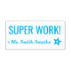 Ce design de timbre en caoutchouc positif comporte le message positif "SUPER TRAVAIL !" et le nom d'un éducateur personnalisé. Il présente également un contour décoratif étoilé. Il pourrait être utilisé par un enseignant ou un éducateur pour marquer les affectations, pour reconnaître que l'étudiant a fait un excellent travail.
