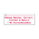 Cette simple estampille en caoutchouc comporte le message "Veuillez vérifier, corriger, initial et retour", ainsi qu'une ligne pour une signature ou des initiales à écrire ci-dessus. Il porte également le nom d’un éducateur personnalisé. Il pourrait être utilisé par un enseignant, un éducateur ou un tuteur pour demander aux parents ou aux tuteurs d’un étudiant de revoir et de reconnaître la note reçue par un étudiant lors d’un test, d’un quiz, d’un examen papier ou d’une autre affectation scolaire.