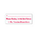 Cette estampille en caoutchouc clair comporte le message "Veuillez revoir, initial et retour", ainsi qu'une ligne pour une signature ou des initiales à écrire ci-dessus. Il comporte également un nom personnalisable. Il pourrait être utilisé par un enseignant, un éducateur ou un tuteur pour demander à ses parents ou tuteurs d’examiner le travail de l’étudiant à l’occasion d’un examen, d’un papier ou d’une autre tâche.