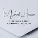 Élégant tampon d'adresse de retour avec votre nom dans un script de signature moderne et élégant et votre adresse dans une simple typographie.