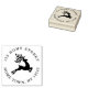 A circular personalized rubber stamp design featuring a leaping reindeer encircled by your address details. Ideal for adding an extra hand stamped touch to your holiday cards.