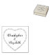 Tampon personnalisé pour couples pour mariage, fiançailles, douche de mariée, anniversaire ou juste comme ça. Noms de typographie moderne élégante au centre d'une couronne de fleurs et de vignes verdoyantes de style d'art folklorique élégant et rustique. Tout le texte peut être personnalisé. L'illustration de cœur tendance a été inspirée par la broderie vintage, les valentines rétro et le style d'art de tatouage simple. Parfait pour les invitations, le scrapbooking, les travaux manuels, les cartes de vacances, les notes de remerciement, ou comme idée de cadeau unique et de bon goût pour un mariage, des fiançailles, une douche de mariée ou un anniversaire.