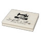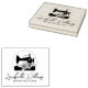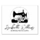 Ce timbre sur mesure comporte une machine à coudre avec des fleurs, un nom et un slogan.