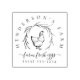 Ce timbre vintage sur mesure de ferme aurait l'air magnifique sur les cartons d'oeufs, les sacs en papier et autres emballages de produits frais de votre ferme familiale! Il présente une illustration vintage d'une poule au centre entourée d'une couronne botanique rustique. En haut, il y a votre nom de ferme de famille en typographie élégante, se tournant gracieusement autour de l'image. En bas, deux textes sur mesure : "élevage d'oeufs frais" en script de calligraphie géologique et un numéro de téléphone. Pour customiser ce timbre, cliquez sur le bouton "Personnaliser ce modèle" et changez les informations.