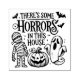 Little Horrors - Timbre en caoutchouc mignon, Déplaisant et plein de caractère Un trio de personnages de dessin animé d’Halloween (une momie, un jack-o'-lanterne et un fantôme) se rassemblent sous la phrase enjouée "Il y a des horreurs dans cette maison", entourée de chauves-souris. Avec des lettres audacieuses et une énergie ludique, le design mêle le plaisir éffrayant à l'ambiance festive, célébrant le chaos et la gentillesse d'Halloween dans une scène délicieuse.