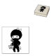 Mignonne caricature ninja fille habillée en noir mais pour un petit arc sur son masque de tête. On peut voir l'épée de katana japonaise traditionnelle attachée au dos. La fille tient un panier.