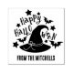 Timbre d'Halloween personnalisé pour vos cadeaux d'Halloween et les faveurs d'Halloween avec Happy Halloween de votre famille écrit sous un casquette sorcier entouré de chauves-souris et d'étoiles.