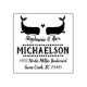 Un couple fantaisiste de baleines flotte au sommet de ce timbre d'adresse. Ci-dessous sont vos prénoms arqués sous les baleines et votre nom entouré d'une bordure en bulle et votre adresse, le tout dans de jolies polices de style manuscrites. Parfait pour estampiller votre papeterie mariage ou comme cadeau pour les couples mariés ou engagés ou tout simplement toute personne qui aime les baleines!