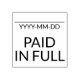 Ce cachet en caoutchouc comporte le message "PAID IN FULL" et une ligne où une date de paiement peut être écrite. On pourrait peut-être l'utiliser pour indiquer qu'une facture ou une facture a été payée.