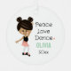 Un ornement de danseuse du robinet adorable avec peau foncée et cheveux noirs en deux petits pains porte un leotard noir, des bas blancs et une jupe rose et une paire de chaussures de danse du robinet. Les mots Peace Love Dance avec un coeur rose. Personnalisez-le avec le nom d'un petit danseur en vert menthe et customisez-le avec l'année de ce joli cadeau pour un danseur. Oeuvre © Chrissy H. Studios, LLC. Tous droits réservés.
