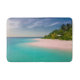 A bath mat with a beautiful photograph. A scenic tropical beach with aquamarine water and a white sandy beach with a lush forest in the back.