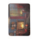 Un coin lecture confortable par jour pluvieux d'automne. Autour du foyer, un feu éclatant, des fauteuils rouges moelleux, des piles de livres, des teacakes et une théière complètent le confort. À l'extérieur, un saule jaune et une haie d'érable et de hêtre rouges sont obscurcis par la pluie qui s'enflamme, qui asperge la fenêtre où un chat gingembre s'assoit en regardant dehors.