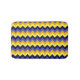 Un petit tapis de bain de taille réduite avec un design motif et sombre de chevrons en bleu, jaune et or.