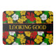 Salle de bain noire à motifs rouge, jaune et blanc fleurs d'hibiscus tropicaux et feuilles de palmiers verts. Au milieu se trouve le guillemet "LOOKING GOOD" qui est personnalisable pour que vous puissiez ajouter votre propre libellé, ou supprimer si vous préférez