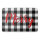 Texte rouge "joyeux" dans un style de police de calligraphie avec le casquette du Père Noël sur le buffle noir et blanc plaid.