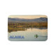 Seul dans le désert. Un canot surplombe l'eau glacée du lac à l'intérieur de l'Alaska. Au loin la taïga typique et les montagnes. Le texte "Alaska" apparaît également. Cette image provient d'une photographie du United States Fish and Wildlife Service.