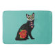 Un chat noir avec un jour de maquillage crâne de sucre mort sur un fond de turquoise.