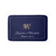 Chic Moderne Monogramme Bleu Noms Nouveau Mariage Mat Bain. Stylisé personnalisé marine bleu et or monogrammed tapis de bain. Écriture classique pour le nom de famille monogrammé initial, les noms de la mariée et du marié et la date sur un arrière - plan bleu marine chic. Un cadeau parfait pour les jeunes mariés, les couples engagés ou les beaux pour votre propre salle de bain. Cliquez sur personnaliser ce modèle pour le customiser avec vos propres noms, le monogramme initial et la date rapidement et facilement. Correspondance de rideau de douche monogrammed et d'autres articles dans la collection de cadeaux de mariage dans mon magasin. Garantie de remboursement de 30 jours. Navires dans le monde entier rapidement. Chic Moderne Monogramme Bleu Noms Nouveau Mariage Mat Bain. Créé par l'artiste RjFxx © *Tous droits réservés. #MonogrammedBathMat #PersonnaliséBathMat #IdéeCadeau #ZazzleMade