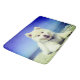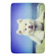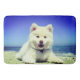 Ce tapis de bain a un mignon chiot blanc représenté dessus.
