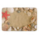 Photo des coquillages, des étoiles de mer, du corail, et du sable comme tapis de bain.