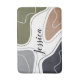 Tapis de bain personnalisé avec un motif géométrique abstrait moderne gris, vert, bleu et beige tons neutres tendance et un imprimé de nom personnalisé au centre. rideau de douche assorti disponible.