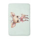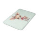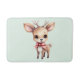 A bath mat with an illustration of an adorable baby deer. Big eyes big ears with a large head and little brown antlers. Wearing a big red bow.