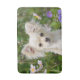 Un jeune Chihuahua blanc crème aux cheveux longs assis dans un jardin fleuri, photo prise par Katho Menden. Ce tapis de bain est une idée cadeau pour les amoureux de les chiens.