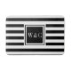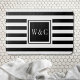 Tapis de bain à monogramme à initiales personnalisées élégant présentant un motif rayé noir et blanc avec vos initiales dans un carré bordé de noir avec un texte blanc classique. Conçu par Thisisnotme©