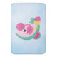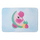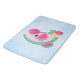 Un tapis de bain avec une jolie illustration d'un flamant rose avec quelques pastèques et ananas. Couleurs rose et vert. L'été et tropical. L'arrière - plan est une aquarelle bleu clair.