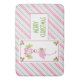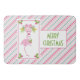 Un tapis de bain fantaisiste de Noël tropical. Un flamant rose élégant avec une jambe levée. Porte un chapeau de Père Noël rose et quelques houx saisonniers. Le houx aux baies décore également les coins. Un bouquet floral avec des cannes à sucre au-dessus de sa tête. Un fond rayé de cannes à sucre rose et vert. Joyeux Noël écrit en lettrage gras vert de style Art déco.