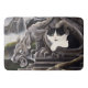 Le chaton tuxedo noir et blanc est assis à côté d'une gargouille. Derrière eux se trouve un château et des dragons.