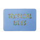 Mosaïque, texte graphique, "Îles tropicales" qui signifie, un lieu fictif, imaginaire exposé dans un exotique, île motif de ; orange, vert olive, jaune, taupe, marron, noir et blanc.