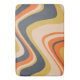 Un design rétro super avec des lignes ondulées dans une palette de couleurs orange, bleu marine, jaune et beige.