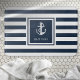 Un élégant tapis de bain nautique avec ancre et motif rayé bleu marine et blanc avec votre nom de bateau dans un carré bleu marine. Conçu par Thisisnotme©