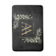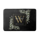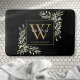 Tapis de bain élégant à monogramme de feuilles de verdure à l'aquarelle moderne avec une initiale de monogramme doré avec votre nom écrit en lettres blanches classiques sur fond noir. Conçu par Thisisnotme©