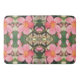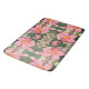 Le motif floral rose sur ce grand bath Mat a été créé à partir d'une photo originale de ZoeSPEAK de fleurs et bourgeons de jatropha rose fleurissant dans le jardin. La photo de clôture montre le centre jaune de la fleur au milieu des pétales roses. Les feuilles verts de la fleur sur un arrière - plan beige finissent le motif.