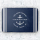 Tapis de bain nautique en bleu marine lisant "bienvenue à bord" ainsi que votre nom et emplacement de bateau personnalisé.