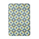Ce motif moderne de la moitié du siècle comporte l'or et des formes bleues.