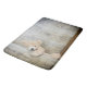 Un tapis de bain avec une photo de chéri d'un mignon ours en peluche, debout près d'un mur en bois rustique / fond.