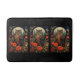 A bath mat with a cool looking owl with a piercing stare. A full moon in the back with a garden of red flowers.