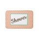 Step out of the shower in style with this fun bathmat that features a trendy retro-style circle pattern in colorful shades of peach and aqua with customizable text that says, "Shower." Modify the text with your own sentiment to create a one-of-a-kind gift for new homeowners, a unique accessory for your own home, or a fun addition to a dorm room shower.