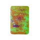 Cette conception abstraite présente une base verte néon avec un motif coloré éclaboussé de peinture en orange brûlé, violet, magenta et aqua et blanc.