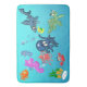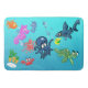 Tapis de bain avec de jolies créatures caricaturales, dont une pieuvre et un calmar, un requin, du poisson, des hippocampes, une tortue de mer et un crabe. Illustrations ©2019 Michael C. Paul