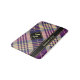 Design écossais violet, jaune doré et bleu. Motif sans couture. Texte et monogramme personnalisés.