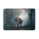 Un tapis de bain avec la photo d'un éléphant asiatique aux oreilles arrondies debout dans un défrichement en regardant vers le spectateur avec la lumière du soleil coulant à travers la canopée des arbres.