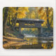 Un pont rustique en bois enjambe une rivière paisible entourée de feuillage d'automne