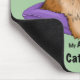 Un chat perse orange sur un coussin violet royal montre son attitude sur fond de vert