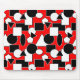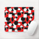 Ce pavé de souris a une conception Bauhaus de triangles, cercles, rectangles et pentagons en noir et blanc sur un champ de rouge.